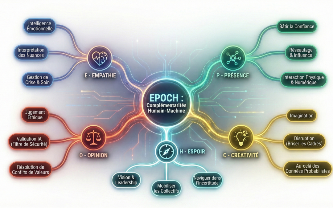 C’est dans ces failles technologiques que s’engouffre la complémentarité homme-machine. Si l’IA automatise les tâches basées sur des règles, l’humain augmente la valeur par des capacités contextuelles. Pour structurer cette transition, le MIT propose le cadre EPOCH, un référentiel de cinq piliers de l’intelligence humaine intensive qui deviennent le nouveau standard de l’excellence organisationnelle.